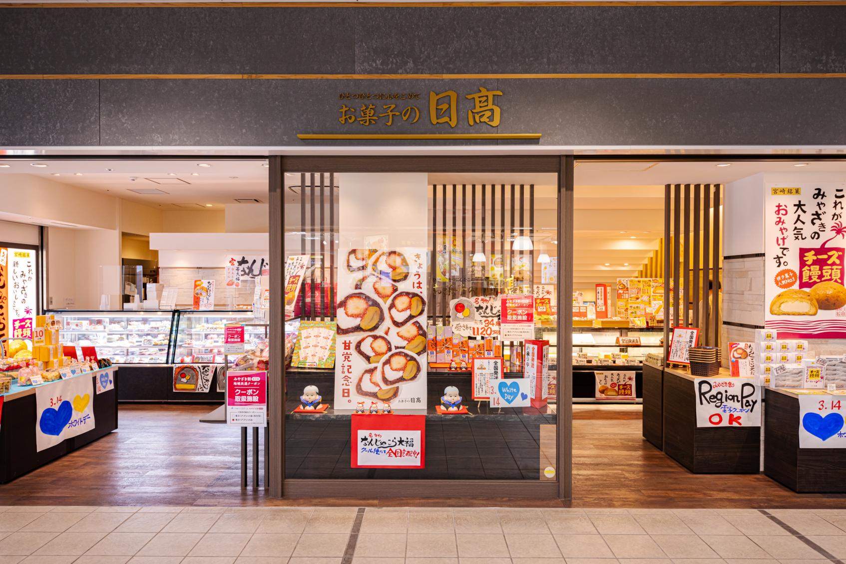 お菓子の日髙は、栗とイチゴとクリームチーズが入った「なんじゃこら大福」が店の名物。ほかにも宮崎のさまざまなお土産が並ぶ「トピカルハウス」や「宮崎名品蔵」など多彩