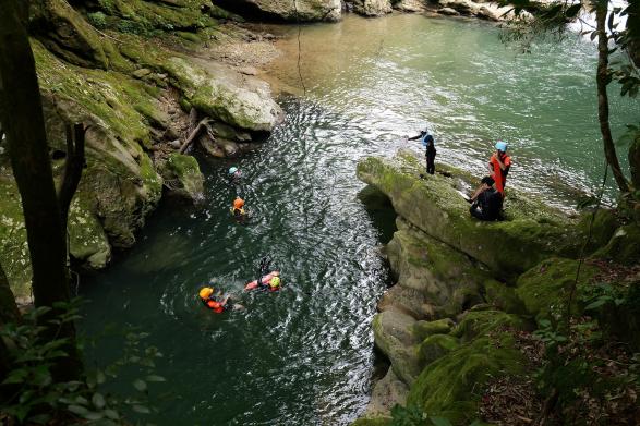 加江田川の清流と原生林に囲まれた大自然の中でキャニオニングにチャレンジ!非日常的な自然体験を通して、チームワークやコミュニケーション能力培い、チームビルディングを行うことができます。