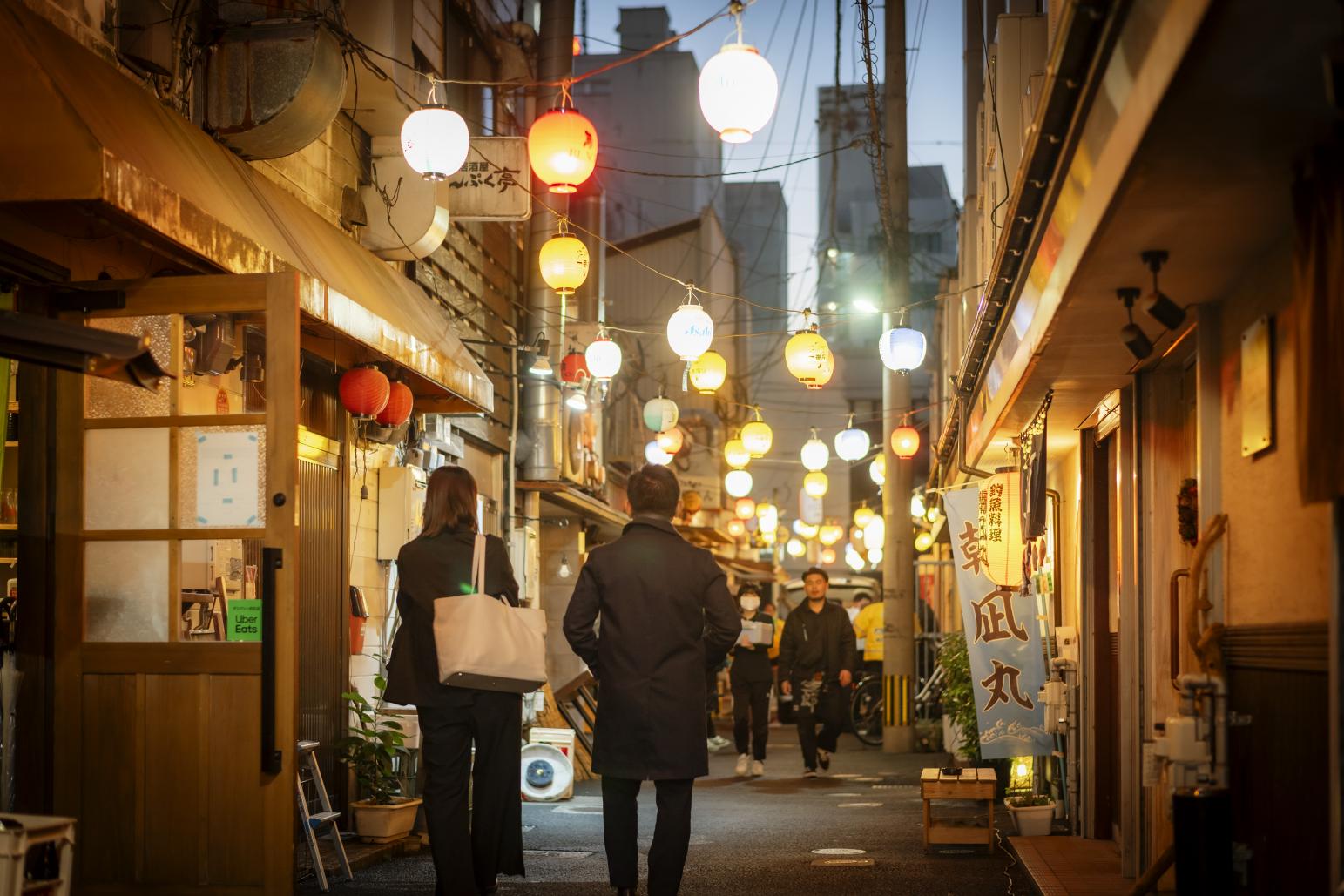 通りの両側には、あたたかい色の提灯がいくつも掛かっていて、