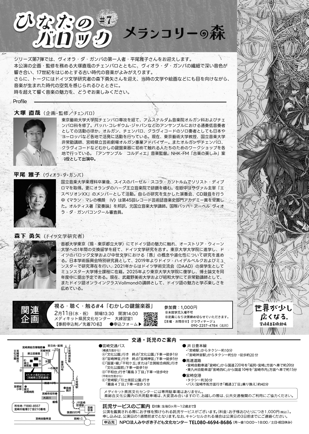 「ひなたのバロック」シリーズ第7弾は、ヴィオラ・ダ・ガンバの第一人者として古楽の魅力を伝えている平尾雅子さんをお迎えします。本公演の企画・監修を務める大塚直哉のチェンバロとともに、ヴィオラ・ダ・ガンバの繊細で深い音色が響き合い、17世紀の音楽が持つ静けさとぬくもりを描き出すコンサート。