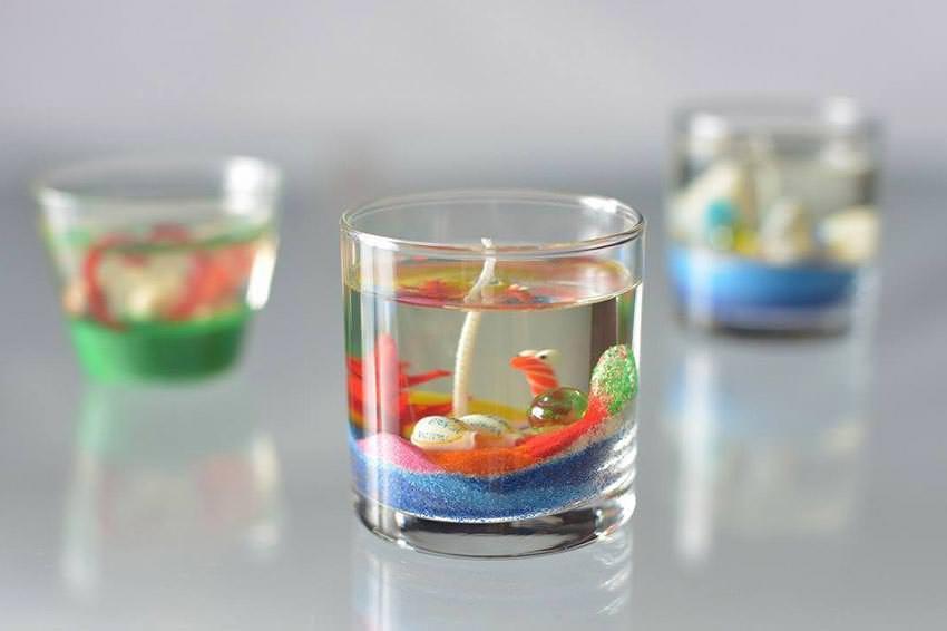 ③ジェルキャンドルづくり 人気のキャンドル。お好きなガラス細工と貝がらやビー玉をカラーサンドの上においてお気に入りのキャンドルを作ろう!