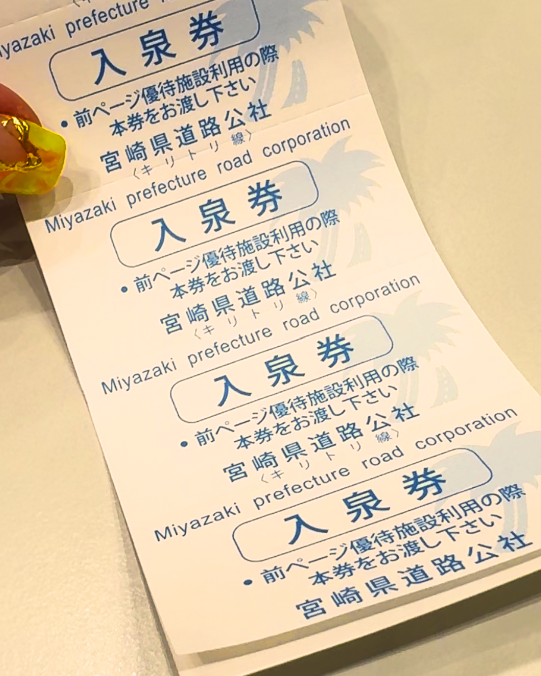 そしてリピーターさんに吉報!こちらの有料道路を利用するときにおすすめなのが回数券(普通車11回分1500円で1回分お得)。お得なだけではなく、回数券1冊毎に「ANA ホリデイ・イン リゾート 宮崎」温泉入泉料、「青島グランドホテル」温泉入泉料の割引優待券が付いてくるので、お得に温泉にも入れます。使うと便利な道路なので、リピーターさんは回数券のご購入をお勧めします。