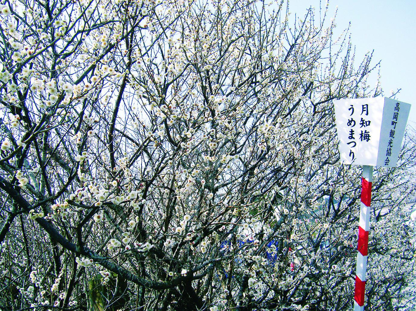 例年の開花時期は2月中旬頃で、白色の八重で非常に気品のある花が咲き、辺り一面にかぐわしい梅の花の香りが漂います。毎年2月中旬には「月知梅うめまつり」が開催されます。