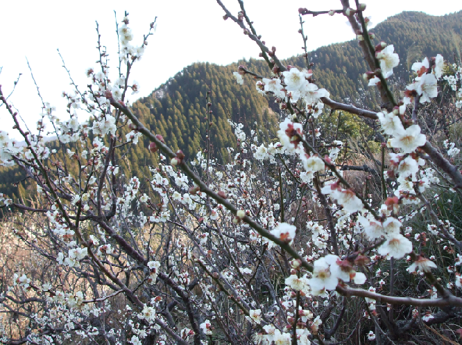月知梅は、高岡町にあり、国の天然記念物に指定されています。この梅は、もとは香積寺(曹洞宗龍福寺の末寺)の客殿の庭にあったもので、延宝元年(1673)に薩摩藩主島津光久が上洛の途中に立ち寄った際、「植えられてどれだけの年月を経たのか、その最初は月だけが知っている」という内容の詩を作り、月知梅と命名したのがその由来といわれています。約200年前までは1株でしたが、枝が垂れ、地について株を増やし、現在では70株ほどの大所帯になっています。