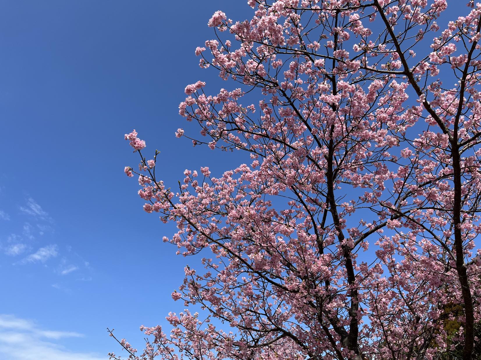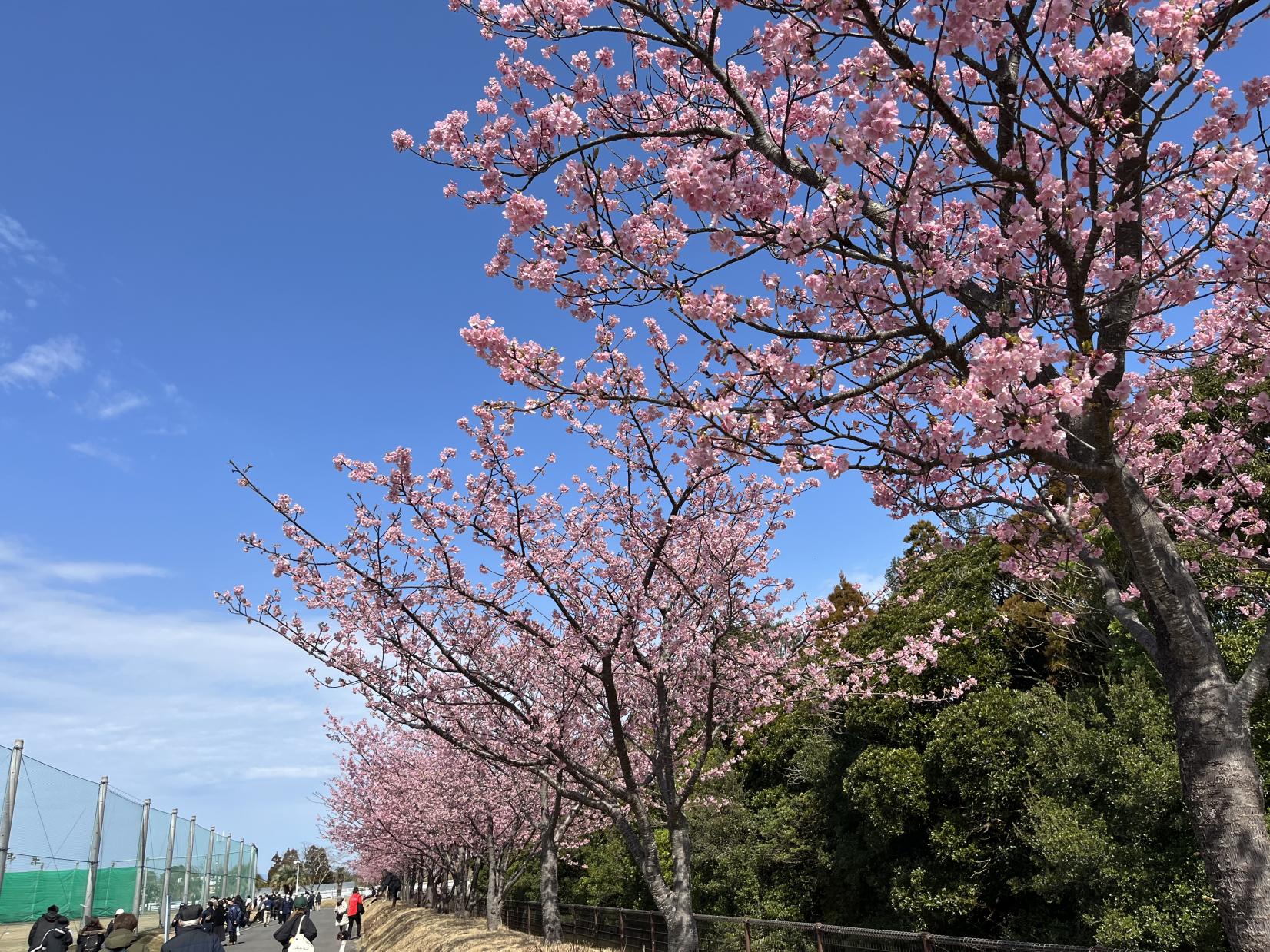 毎年プロ野球キャンプが行われるひなた宮崎県総合運動公園。ひなたサンマリンスタジアム宮崎の東側には河津桜が咲きます。河津桜とは、1月下旬から2月上旬にかけて開花する早咲きの桜です。花は淡紅色で、ソメイヨシノよりも桃色が濃いのが特徴です。