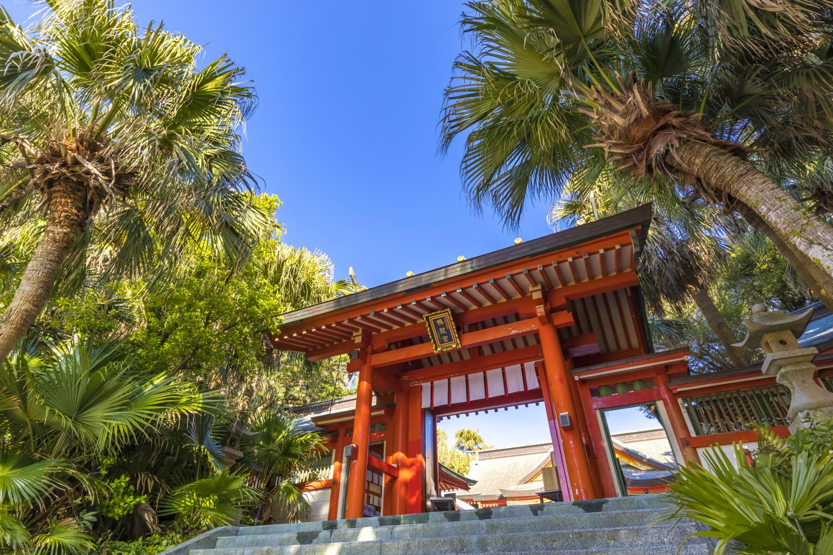 青島にかかる「弥生橋」を渡り鳥居をくぐって青島神社へ。亜熱帯植物に囲まれた神社にはたくさんのフォトスポットが!もっと見る -