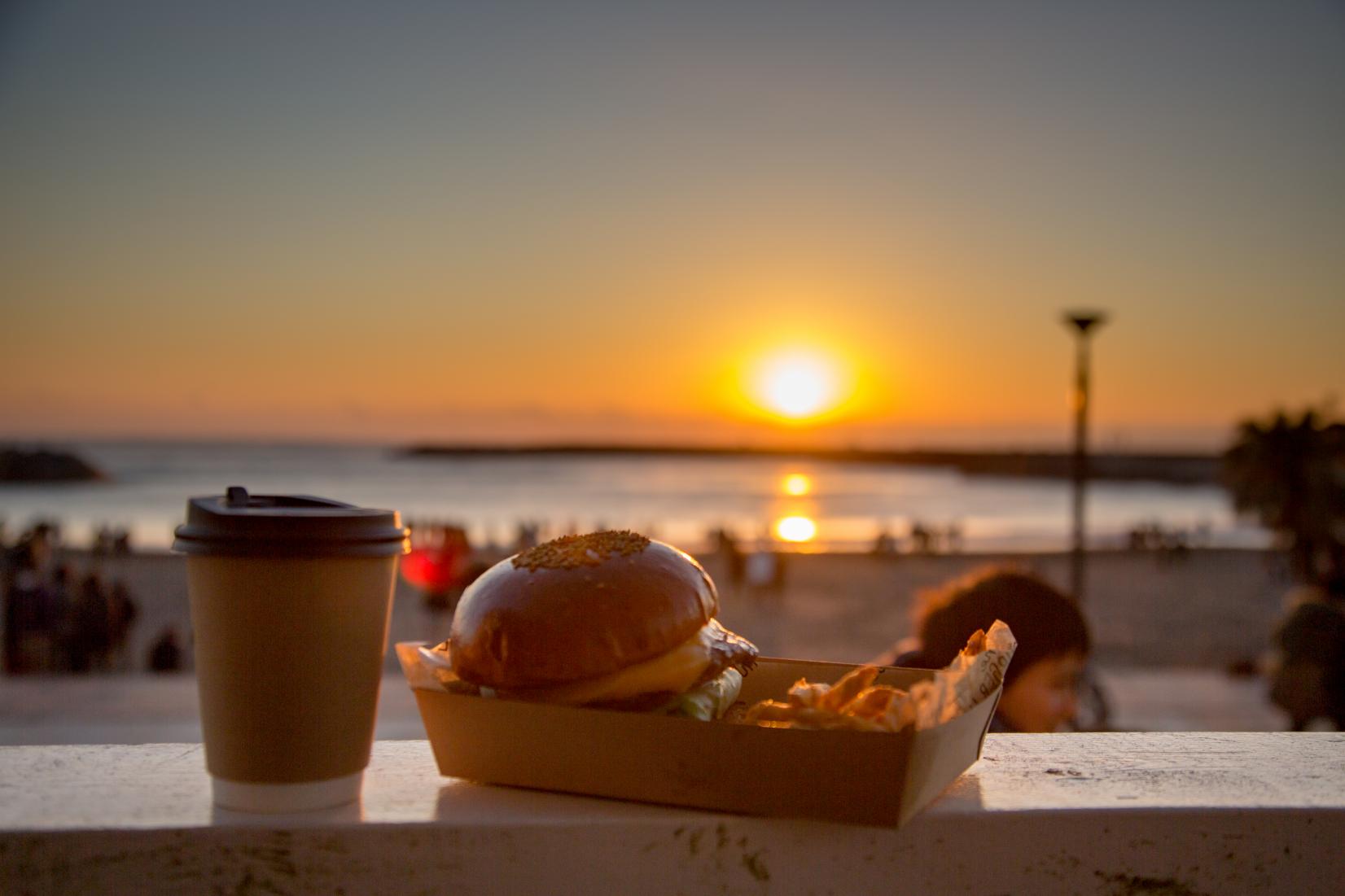 ハンバーガーのほか、あたたかいスープやホットコーヒーを飲みながら日の出を待ちましょう♪