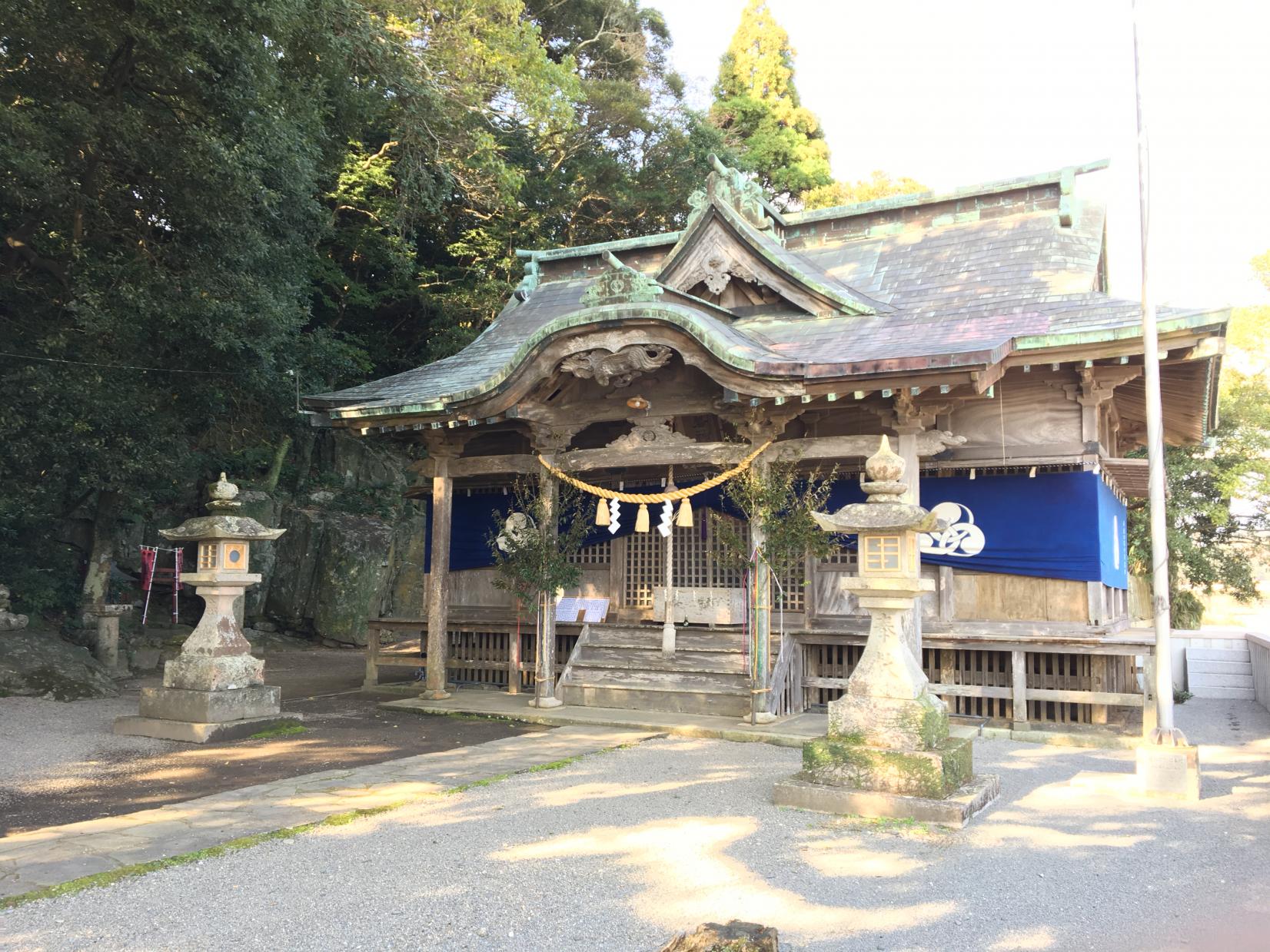 神武天皇は東遷に向け美々津港で船の建造にとりかかりました。立磐神社の境内には神武天皇が腰掛けて身を休めたとされる「御腰掛岩(おこしかけいし)」などもご聖蹟として祀られています。