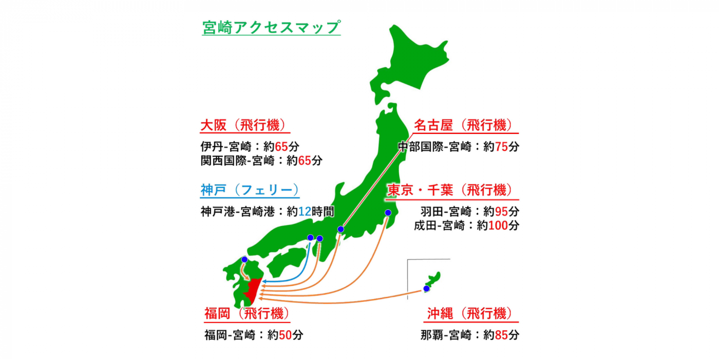 県外から宮崎にお越しの際は、飛行機やフェリーをご活用いただけます。