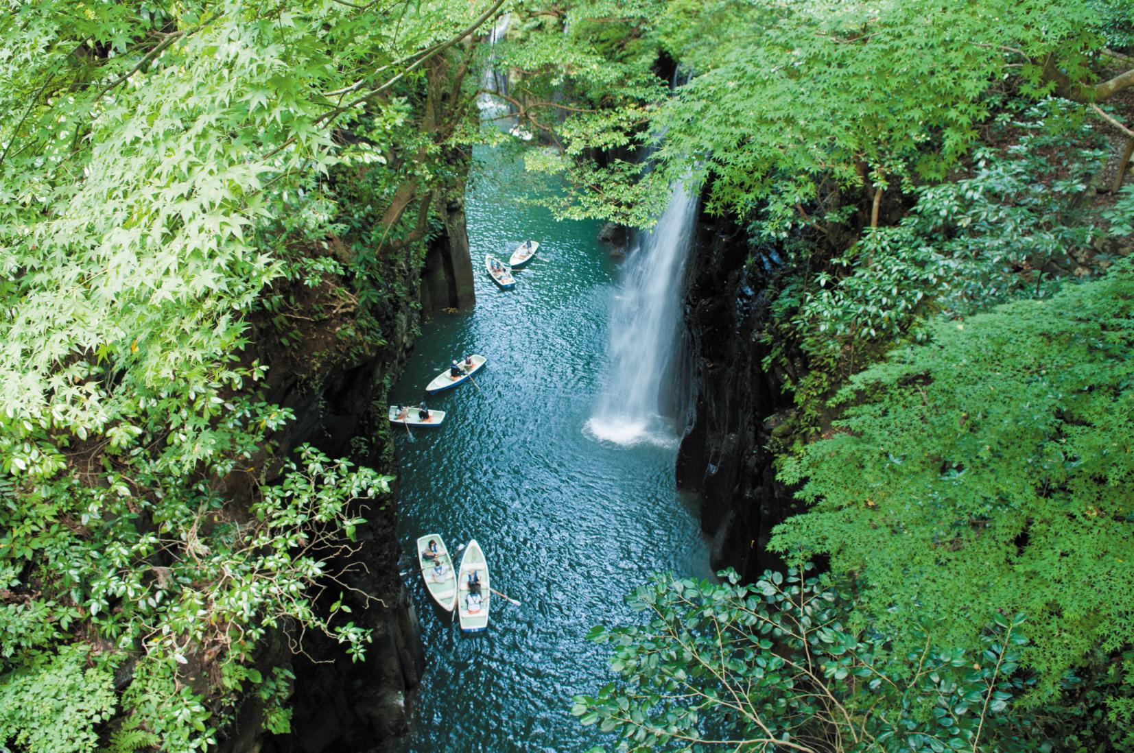 高千穂峡の象徴ともいえるのが、日本の滝百選に指定されている『真名井の滝』。ボートを借りて自然のパワーを近くで感じるのもおすすめです。峡谷沿いの遊歩道を歩いて散策することも可能。切り立った崖やエメラルド色の川はフォトジェニックな美しさです!