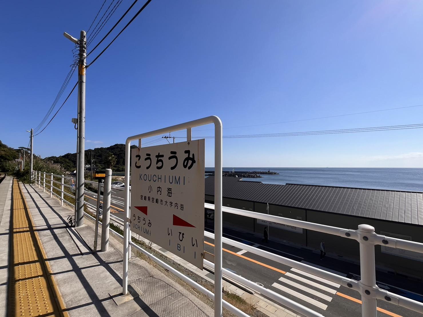 宮崎駅からJR日南線に揺られて約50分。ホームから臨む日南海岸が美しい小内海駅。絶景を目当てに下車する方もちらほらと。この小内海駅は、2021年9月台風14号の接近に伴う大雨で、土砂崩れが発生し一時運休を余儀なくされました。現在はきれいに整備され、晴れた日には真っ青な海を目の前に眺めることができます。