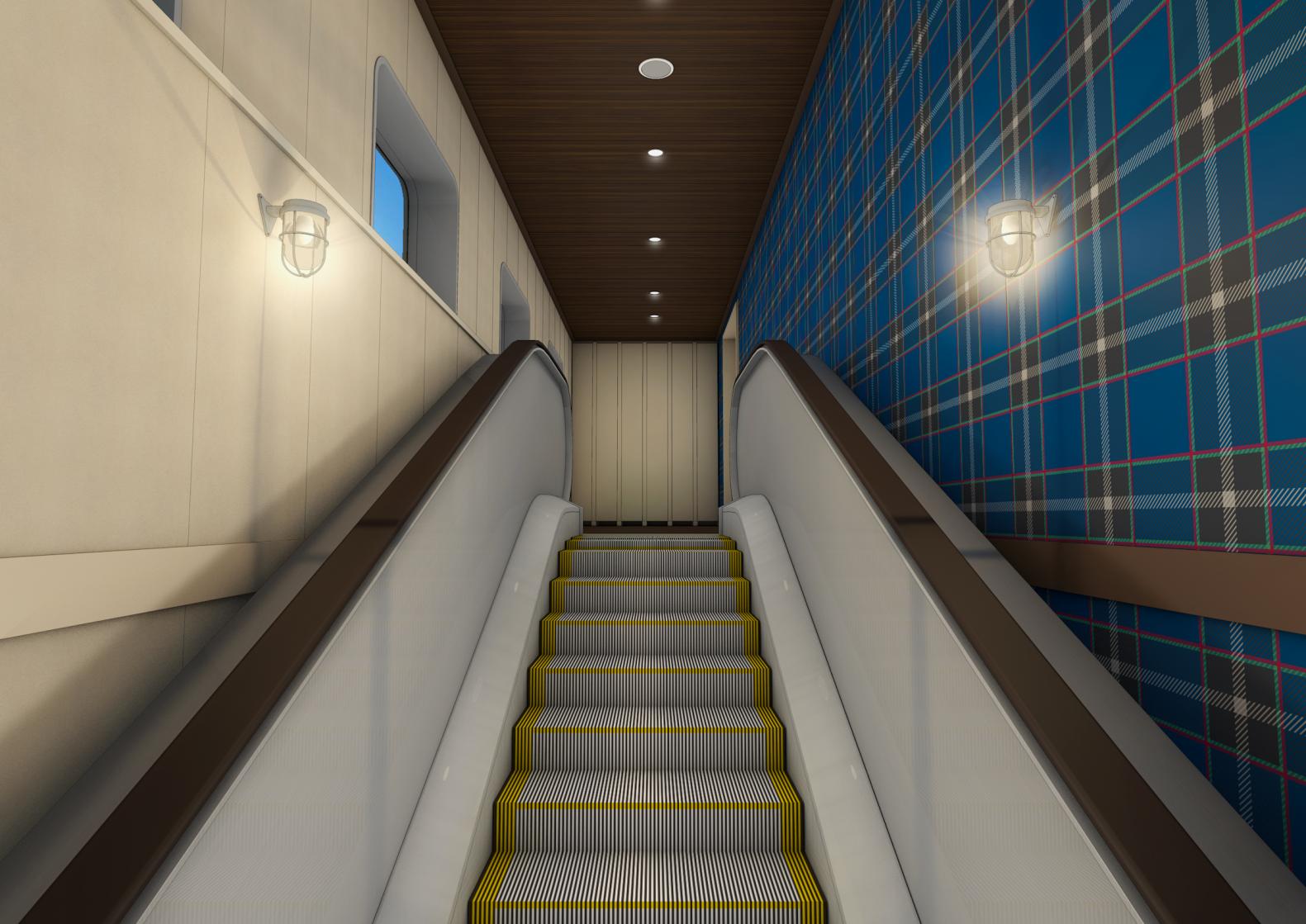 乗船し、ロビーへとつながるエスカレーターの壁紙は、みなと神戸の海のブルー、街に多く見られる白亜の建築物や真珠の白、ポートタワーや神戸大橋の赤、