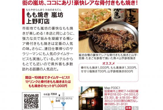 宮崎でうまいもも焼きが食べたいならこの「嵐坊」!自慢の骨付きもも焼きは素材の新鮮さに自信があるからこそ出せるミディアムレア。最高級備長炭の強力な炎で旨みを一気に凝縮させ、オリジナルのブレンド岩塩で味付けしたジューシーな逸品。プロスポーツ選手や県外客も多く訪れる人気店だ。