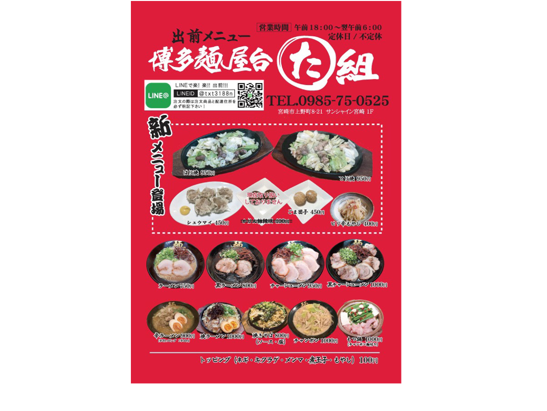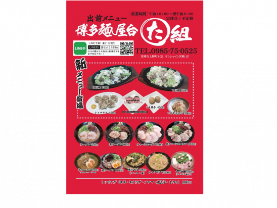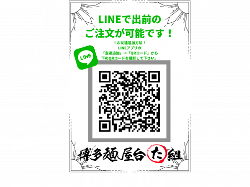 麺は博多ラーメン特有の細麺を使用し、デリバリーの際には伸びにくい中太ストレート麺を使用しております。