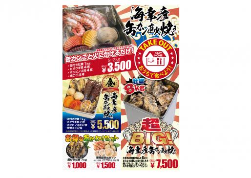 かきごやの味をそのままテイクアウトできる「缶カン直火焼(かんかんじかびやき)」が大好評!なんと青島で育てられた史上初の生ガキ、海幸彦牡蠣(うみさちひこかき)もテイクアウトできるようになりました。BBQ用のお持ち帰り海鮮類も充実!