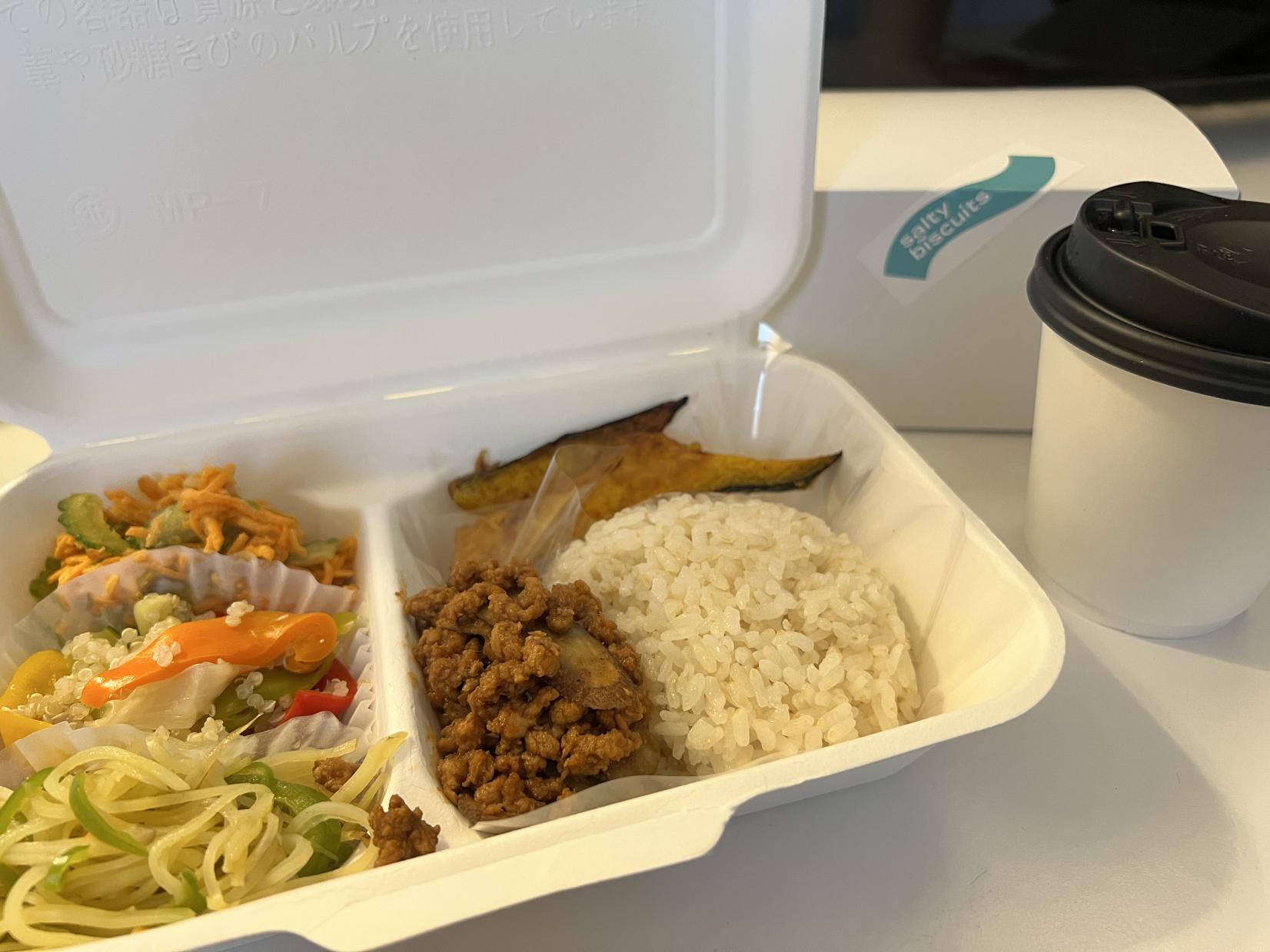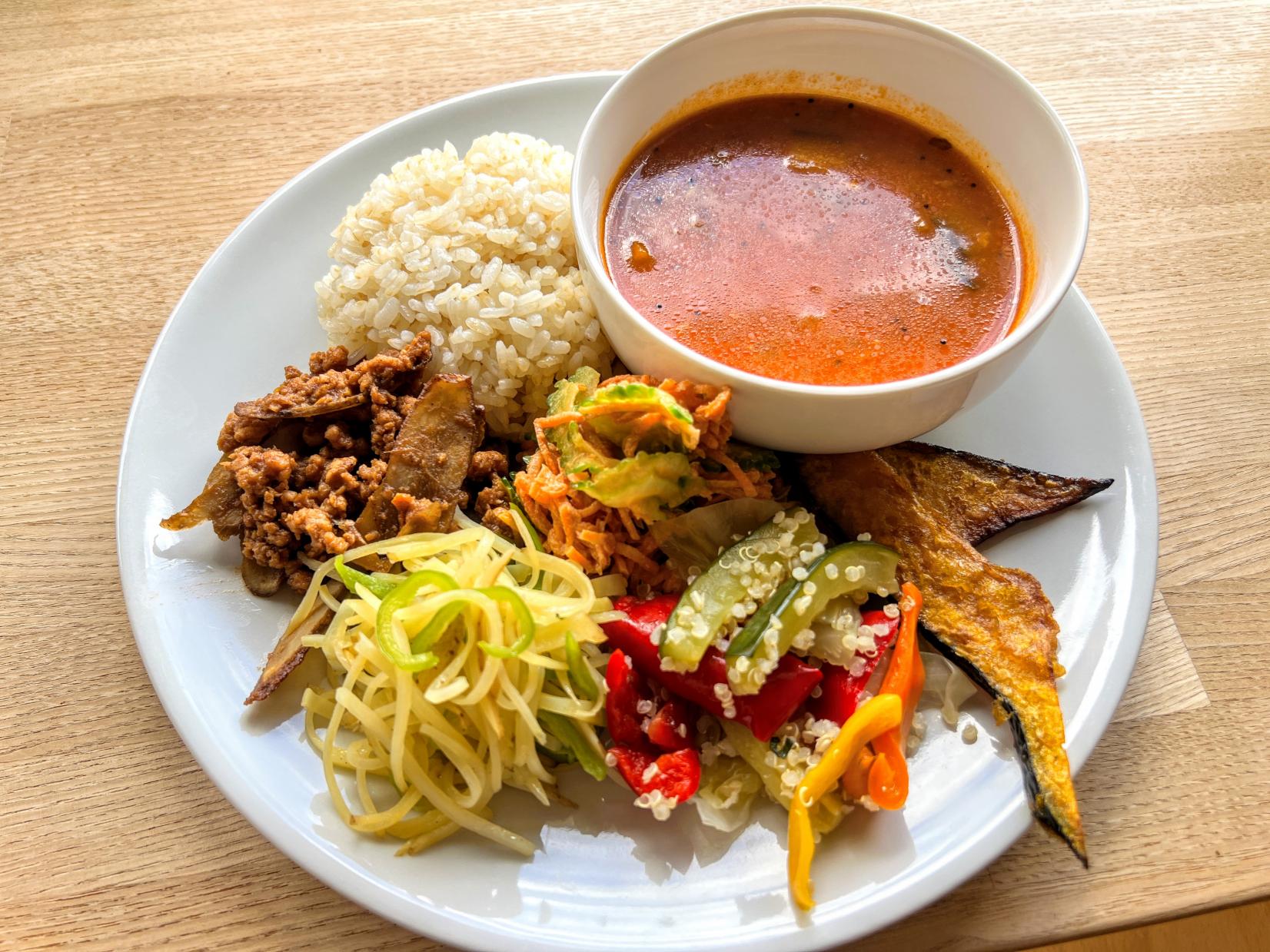 메인 런치 플레이트는 오가닉 재료를 사용한 현미・계절 스프, 제철 야채를 사용한 샐러드나 조림, 대두 단백질 등 플랜트 베이스의 메뉴로 되어 있습니다.
