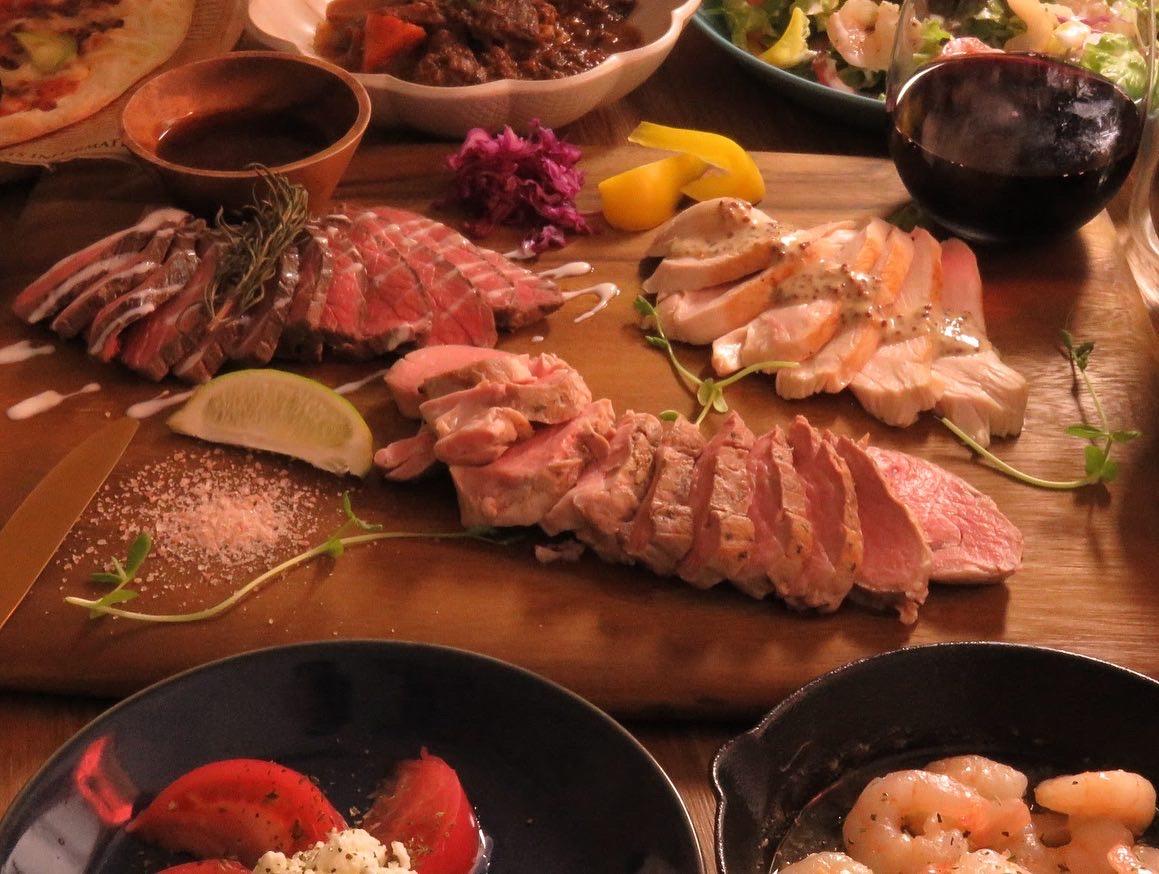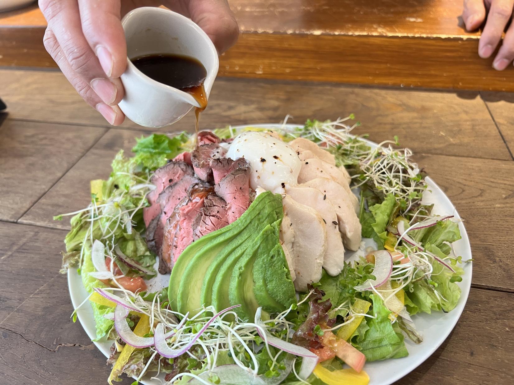 미야자키현산의 닭 가슴살, 와규와 오지 비프를 저온 조리, 충분히 지방분을 줄이면서도 맛은 제대로 느낄 수 있는 부드러운 식감이 일품입니다. 베이스의 현미에 고기, 반숙, 아보가도, 계절 야채가 듬뿍 있어 끝까지 질리지 않는 맛.