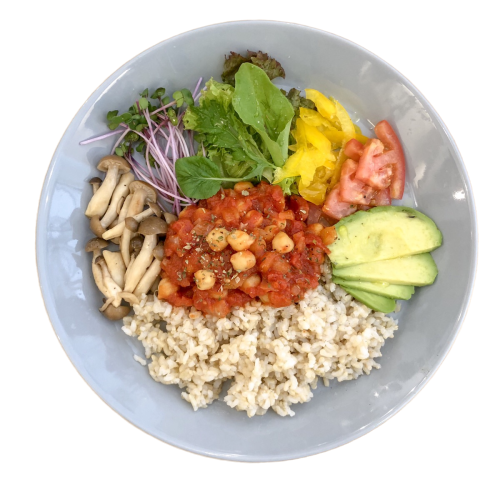 미야자키현산 현미에 병아리콩 토마토 조림, 아보가도, 계절 야채 토핑, 맛있고 건강한 추천 일품. 현미는 콜리플라워 라이스로 변경도 가능.