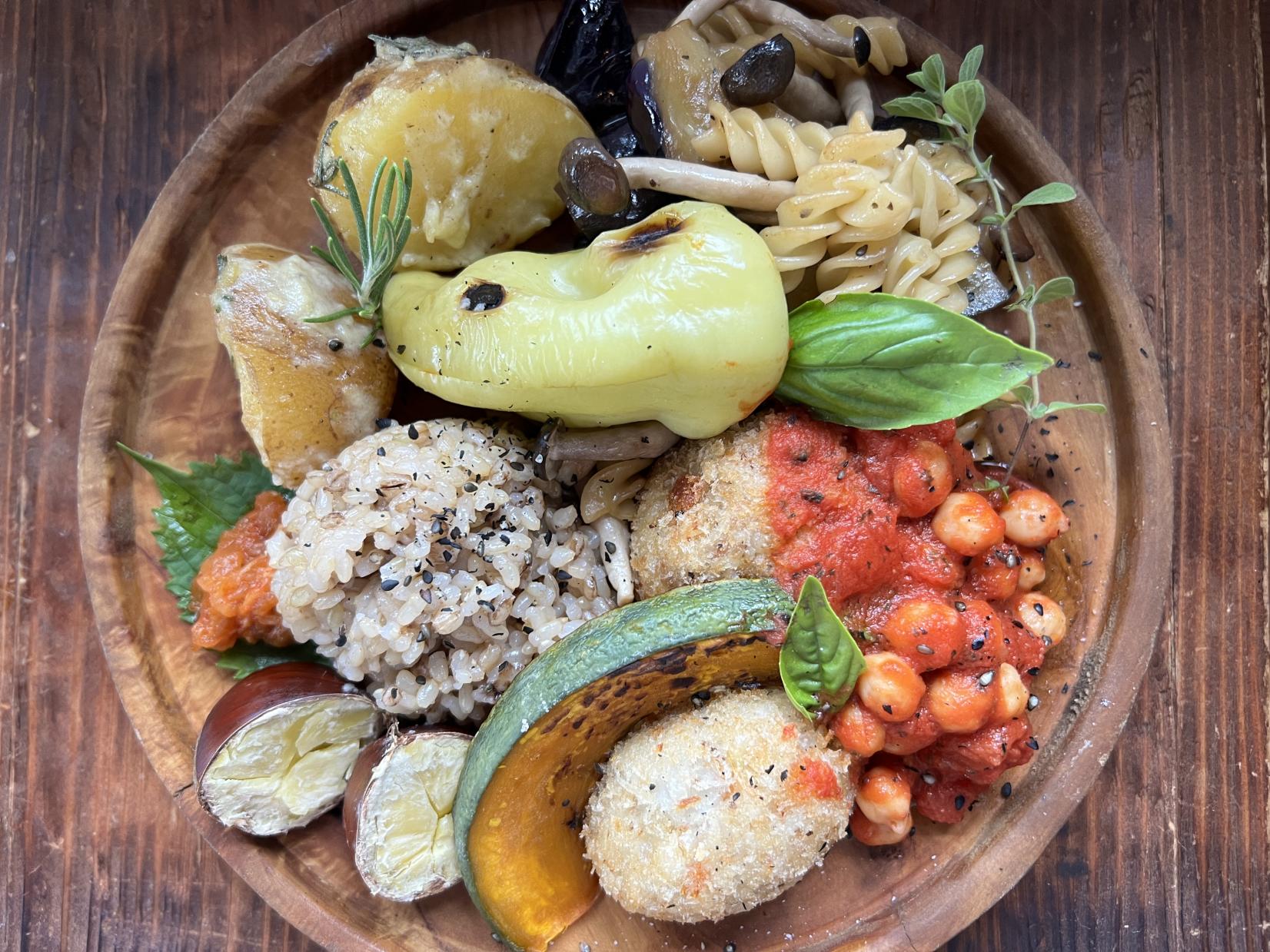 메인 플레이트 사진②는 아야초에서 잘 계승된 찹쌀 ‘다이시모치’의 현미 밥, 두유・밀기울・유채 기름 등으로 만들어진 크림 고로케, 병아리 콩의 토마토 조림, 바나나 피망의 로스트, 오늘 아침 밭에서 얻은 밤, 감자&로즈마리, 듀럼 세몰리나 100% 파스타와 버섯 등 하나 하나가 풍부한 맛으로 매우 호화로운 일품입니다.