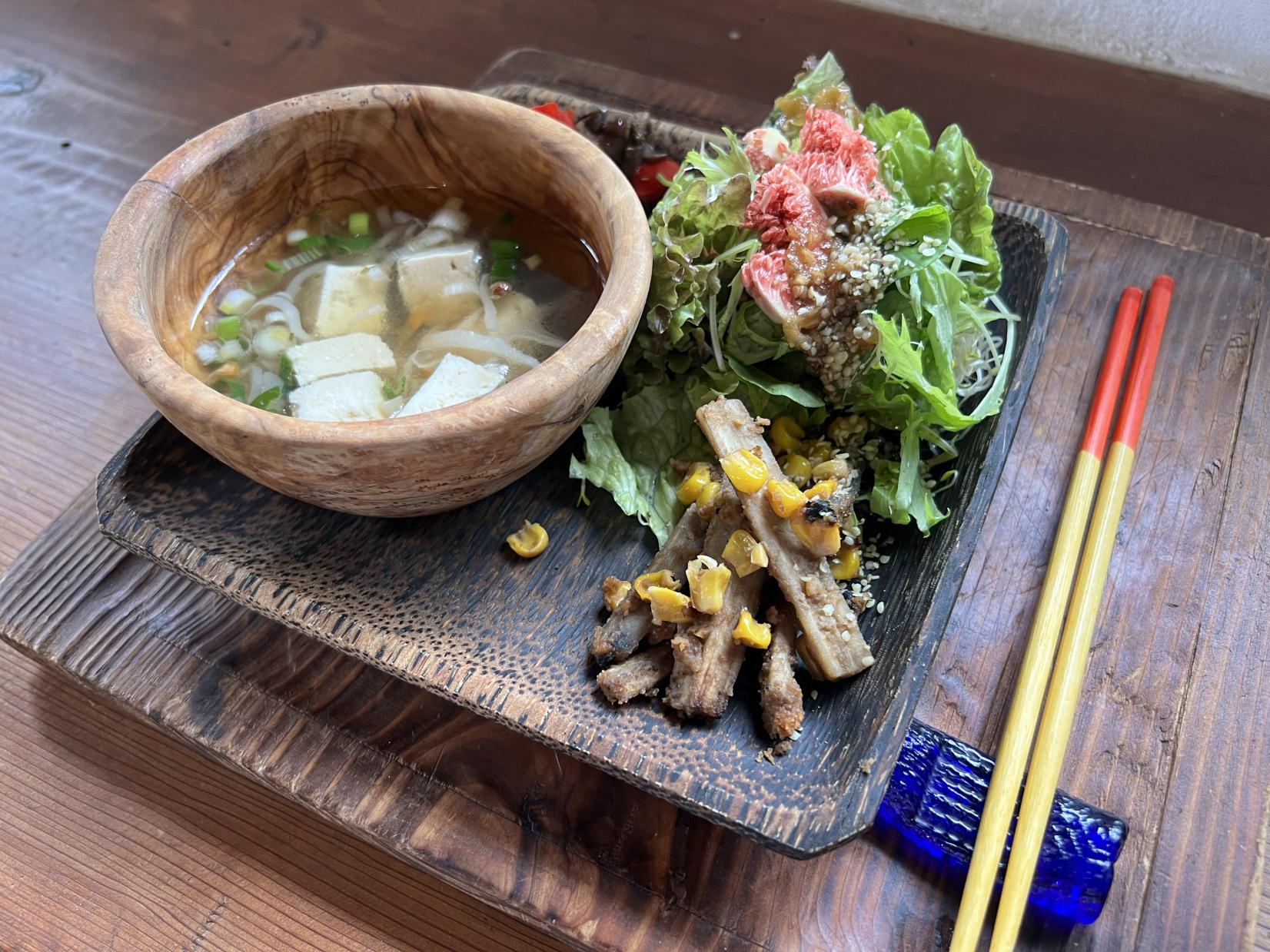 현지 아야마치의 유기질 야채를 사용해 동물성 미사용, 오가닉, NonGMO(유전자 재조합이 아님), 첨가물 미사용을 고집해 만드는 아유르베다, ※마크로비오틱, 로푸드 등의 지혜에서 얻은 요리를 제공하고 있습니다.