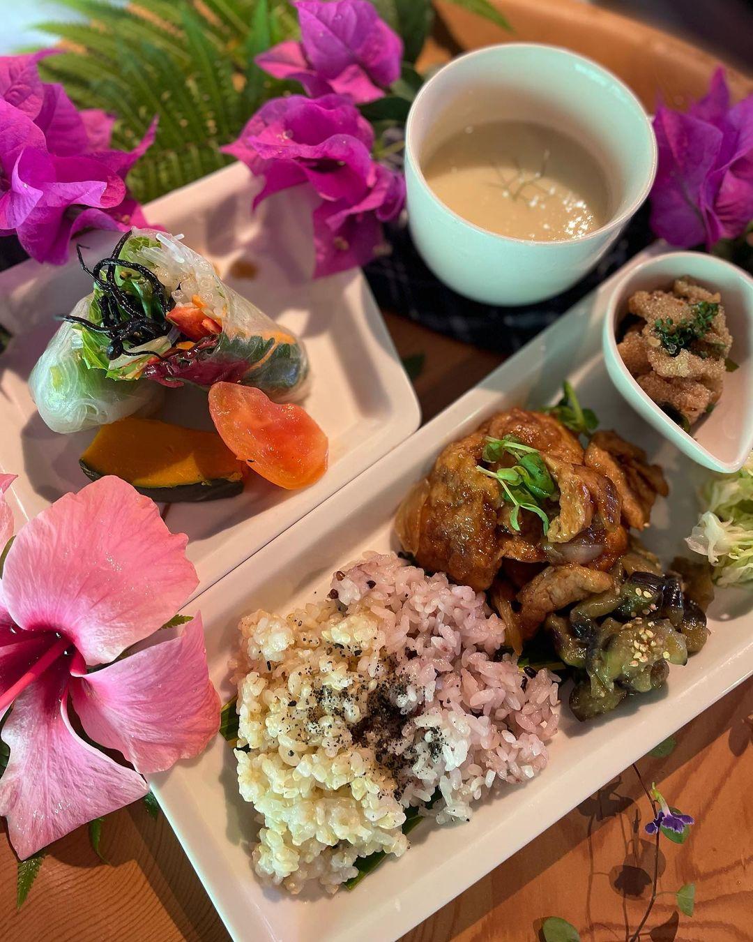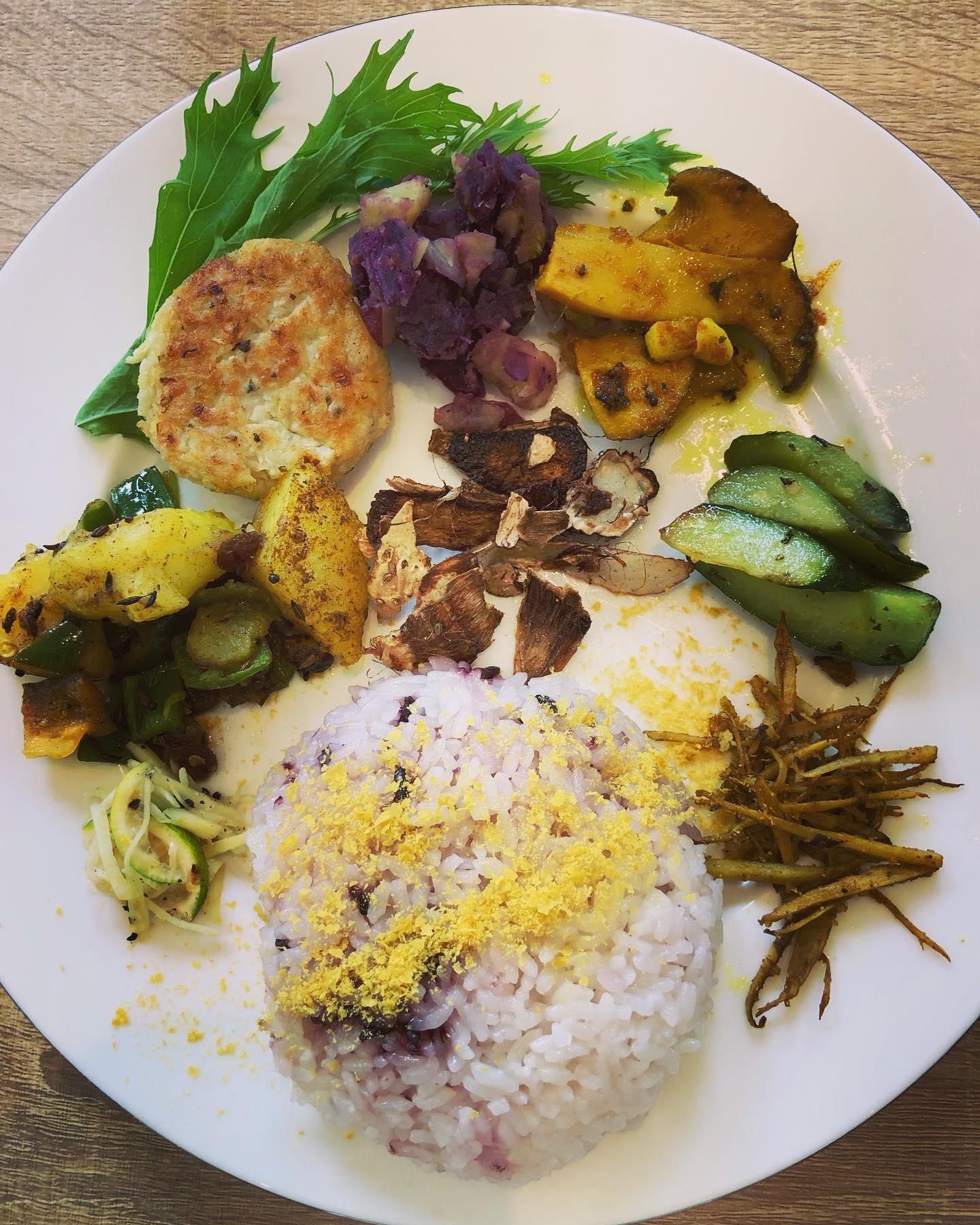 점심 시간 인기 런치 플레이트는 오늘의 메인에 좋아하는 총채 2종을 선택할 수 있고, 밥・스프・샐러드 포함. 게다가 모두 글루텐 프리, 동물성 제품은 사용하지 않는다는 미야자키에서도 드문 비건 요리 카페. 해외에서 17년간 8개국의 여행을 거쳐 미야자키로 일시 귀국.