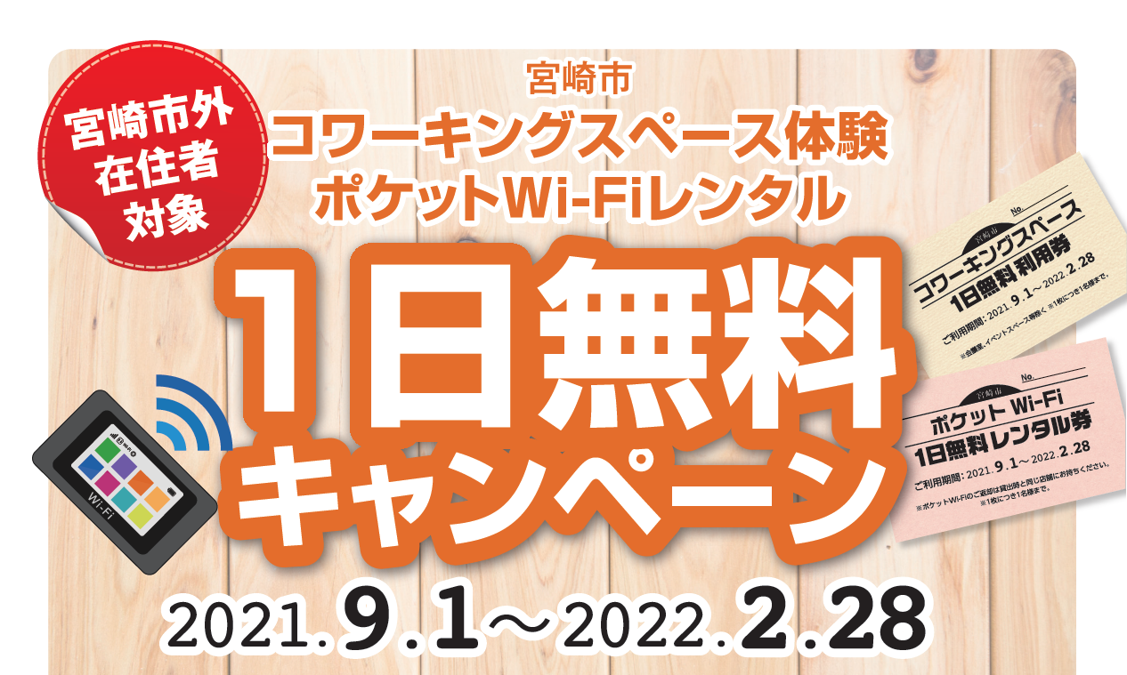 宮崎市外在住者の方を対象に、コワーキングスペース体験やポケットWi-Fiレンタルの1日無料キャンペーンを2月末まで実施中!
