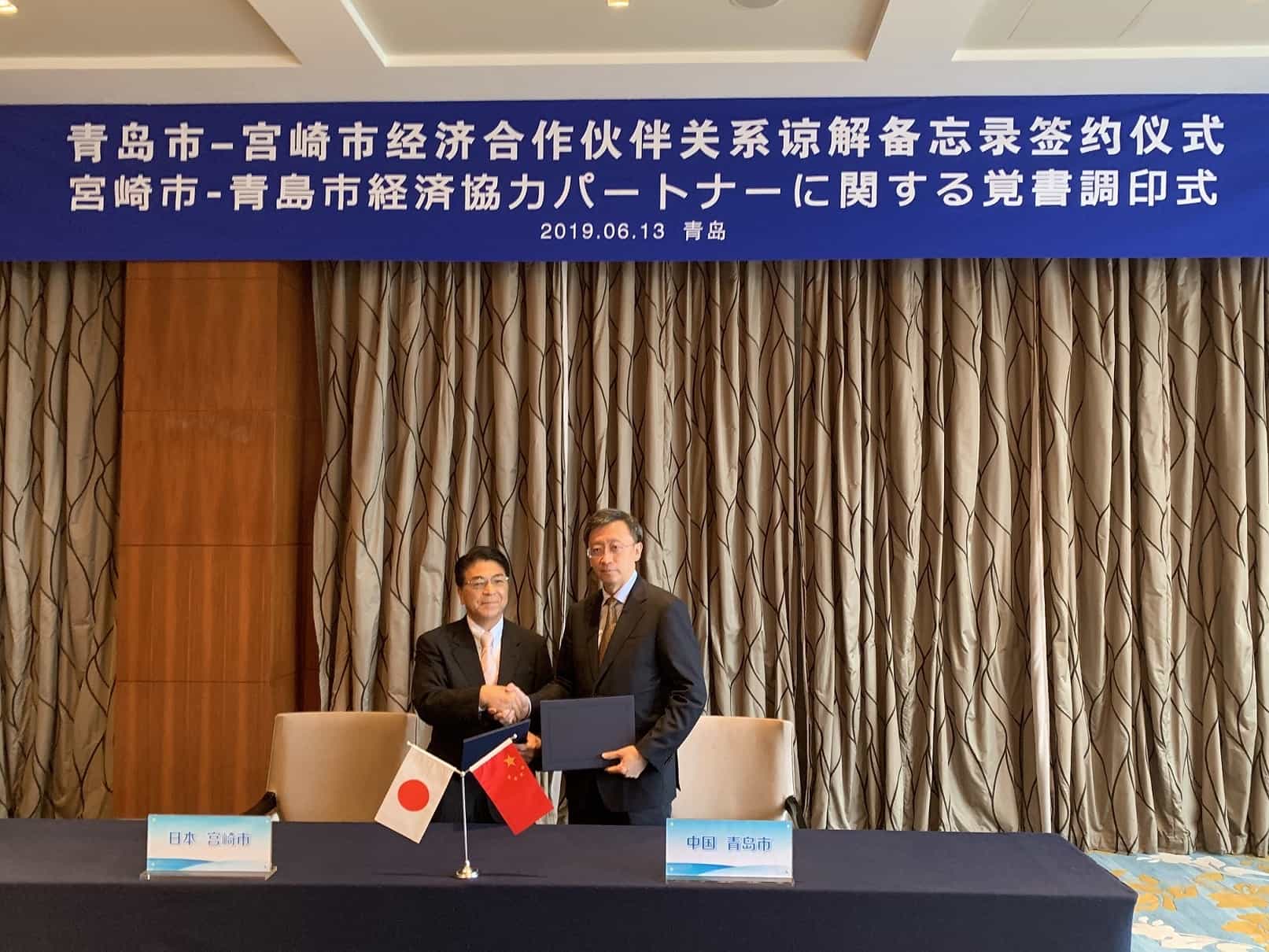 また、観光分野に限定した交流にとどまらず、経済や貿易に関する交流や協力を通して、互恵関係の構築を目指すことを 目的とし、2019年6月13日青島市(薛慶国副市長)と宮崎市(戸敷市長)は青島市にて経済協力パートナーに関する 覚書を締結しました。