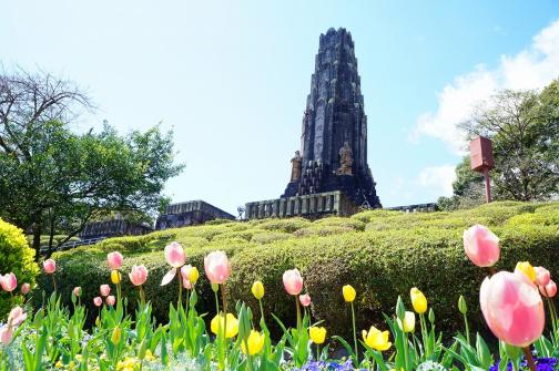 宮崎市の高台に位置する平和台公園は、季節の花々と緑が美しい公園。春は桜の名所として、秋は紅葉スポットとして地元民の憩いの場所となっています。