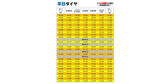 7/1(火)~8/31(日)は、特に気温の高い13:00~15:00を運休とする夏ダイヤにて運行いたします。