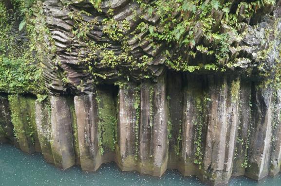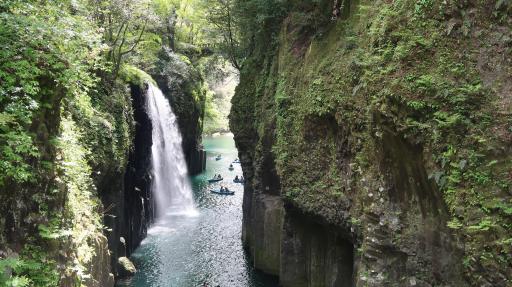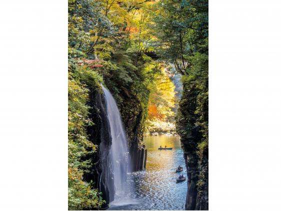 高千穗峽由阿蘇山爆發所形成的美麗柱狀斷崖構成。地標「真名井瀑布」能自己划船靠近賞玩,景觀令人屏息。期間限定的打燈、楓紅也不容錯過。周邊並散佈著眾多日本神話相關神社、景點。